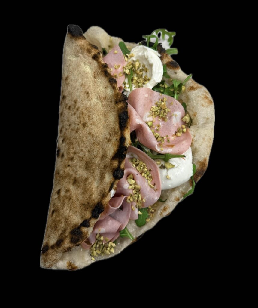 Crème, fior di latte, mortadelle IGP de Bologne à la pistache, ricotta, pesto de pistaches maison, pistaches torréfiées et concassées, basilic frais