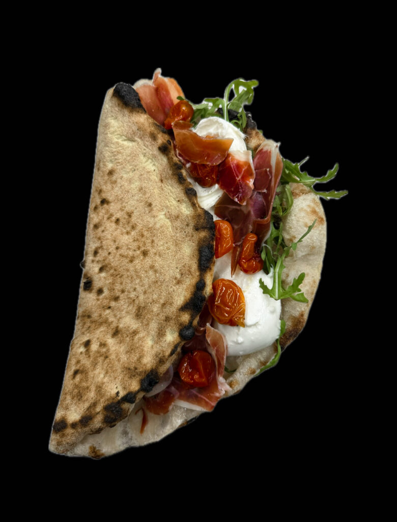 Pesto maison, Burrata entière, tomates cerises confites maison, jambon de parme AOP, roquette