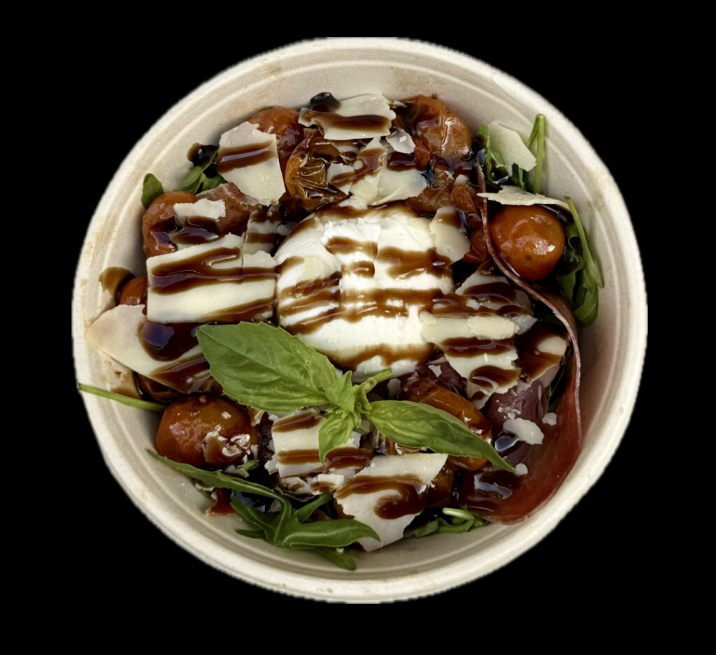 Roquette, Burrata entière, tomates cerises confites maison, copeaux de grana padano, crème balsamique